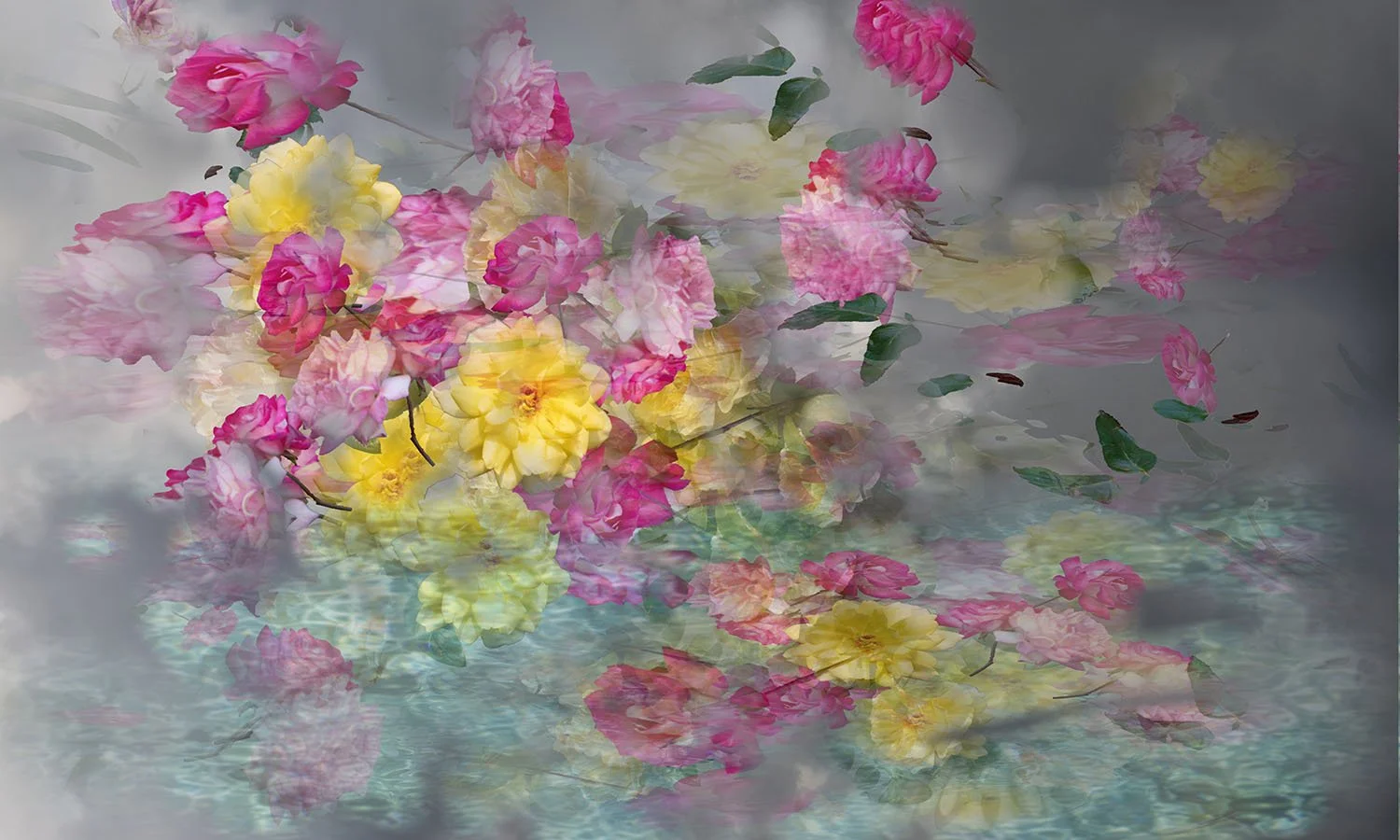 Step into a dreamlike world with this mesmerizing surreal flower art, where delicate roses in soft pink and golden hues float effortlessly, reflecting in tranquil waters. This piece captures a sense of serenity and mystery, blending reality with a touch of fantasy. The gentle ripples of the water and the ethereal quality of the reflections create a soothing, almost meditative effect—perfect for bringing a calming atmosphere into your home.