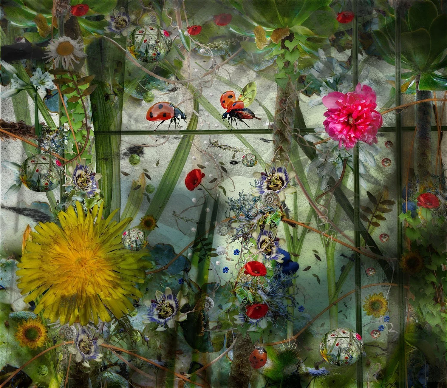 two ladybirds confront each other surrounded by flowers including dandelions, poppies and passions flowers